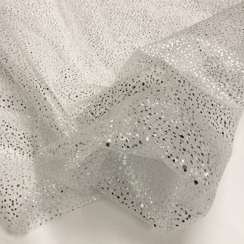 Tulle leggero e impalpabile con un'elegante finitura argentata. Perfetto per creare dettagli scintillanti in abbigliamento e accessori moda. Ideale per decorazioni di eventi, fiocchi per bomboniere, costumi teatrali e fai da te creativo. La sua trasparenza e brillantezza lo rendono una scelta raffinata per realizzazioni uniche.