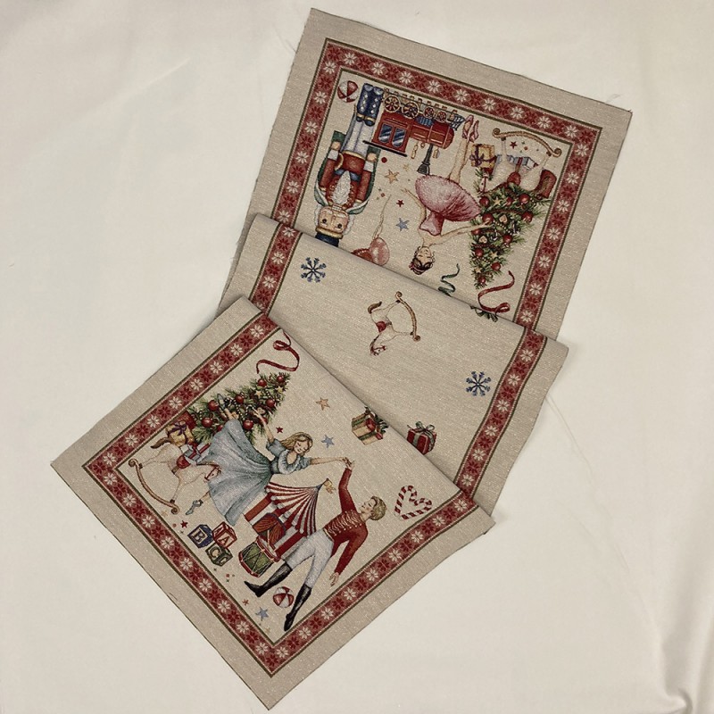 Il Runner Natalizio Ballo di Natale è un tessuto in gobelin, arricchito da fili di lurex che donano un raffinato effetto brillante, perfetto per le decorazioni natalizie.